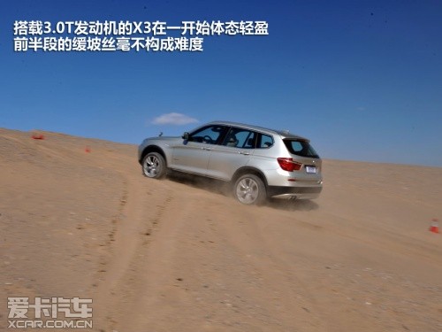 或許是奧迪Q5完成測試的過程比較順利,我們對接下來即將登場的寶馬X3也普遍比較看好,這或許就是思維慣性帶來的固定套路吧。然而在實地測試過程中,這臺X3攀爬沙丘的過程卻沒有表現(xiàn)出它在公路上所煥發(fā)出的霸氣。400?!っ椎淖畲笈ぞ卦诔鞘械缆分校踔猎诟咚俟飞隙际菬o與倫比的,但移步至眼前狂風(fēng)大作的沙丘,這400?!っ椎呐ぞ貏t像是心有余而力不足的悲情英雄。