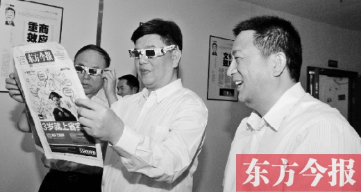 童剛副局長十分關心東方今報的發(fā)展,向東方今報社社長趙國平詳細詢問了解報社的新聞宣傳、廣告經營、發(fā)行情況以及員工待遇,得知東方今報全省發(fā)行覆蓋、全媒體聯(lián)動運營并在河南率先發(fā)行出版3D版報紙時,童剛副局長在調研現場興趣盎然地戴上3D眼鏡體驗,并贊揚東方今報的創(chuàng)新走到了前列。
