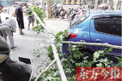 原來,當(dāng)天下午1點25分,張先生和朋友一起吃飯,將自己的標(biāo)致207轎車停在了鄭州市靠近文化路的緯一路上,不料,幾分鐘后,一根長約六米的樹枝從天而降,將他的車后窗玻璃砸爛,車身也被砸凹了。