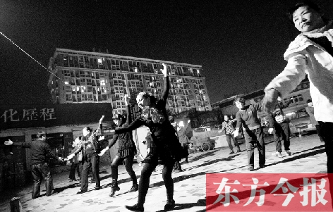 一塊百十平方米的小場(chǎng)地,距離居民樓不到10米。一盞探照燈,一個(gè)可滑動(dòng)的大音響,伴隨著歌曲,三三兩兩的人就火熱開跳了。不遠(yuǎn)處,陸續(xù)還有人來(lái)。甩開外套,加入隊(duì)伍中。