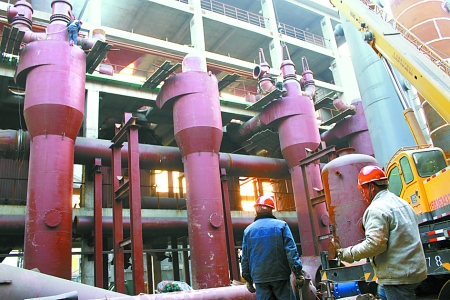 3月16日,河南煤化安化集團(tuán)公司造氣系統(tǒng)16臺新型節(jié)能造氣爐技術(shù)改造項(xiàng)目正在緊張施工,項(xiàng)目全部投產(chǎn)后,每噸合成氨耗煤有望下降10%以上,年增經(jīng)濟(jì)效益5000萬元。 李希軍 攝
