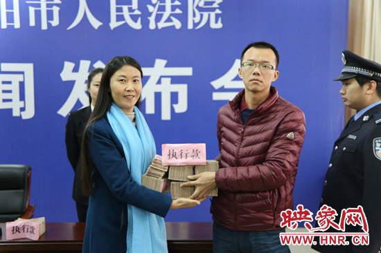 在發(fā)布會現(xiàn)場,全國人大代表、鄭州海龍集團董事長徐曉同志為兩起典型案件當事人家屬現(xiàn)場發(fā)放執(zhí)行款。