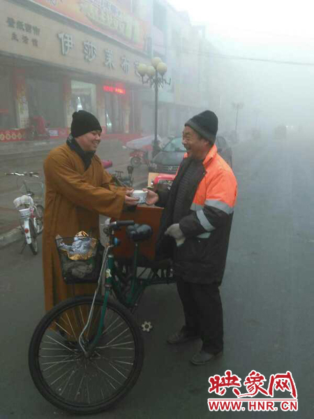 僧人名叫釋妙亮,是滎陽(yáng)市豫龍鎮(zhèn)興國(guó)寺法師。他說,早上6天他們出發(fā)了,截止早上7時(shí)30分,他們已經(jīng)免費(fèi)送了三桶臘八粥。