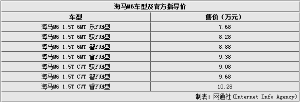 海馬汽車在進入新一輪快速發(fā)展期以來,除了實現(xiàn)產(chǎn)品平臺的升級和新產(chǎn)品的推出之外,最重要的一項便是創(chuàng)新技術運用。海馬旗下全新A+級轎跑車M6正是遵循此理念推出的車型。網(wǎng)通社在上海車展第一時間發(fā)回現(xiàn)場報道,海馬M6于今日正式上市,新車售價區(qū)間為7.68-10.28萬元,共7款車型。這款新車搭載了一臺1.5L渦輪增壓發(fā)動機,匹配CVT變速箱。此外,新車還是海馬旗下首款搭載“moofun”系統(tǒng)的車型。
