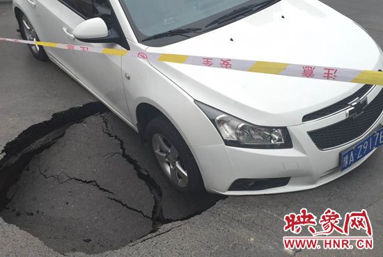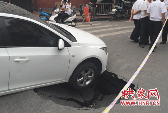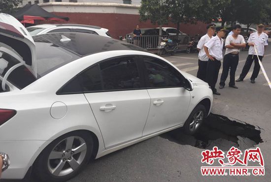 映象網(wǎng)訊(記者 駱瓊 王寬 文/圖)鄭州一條路又塌了,一個(gè)私家車被“坑”在了十字路口。8月17日中午12時(shí)15分,市民王女士開(kāi)車行至經(jīng)二路緯四路交叉路口時(shí),突然地面下陷,車輛右前輪懸空,目前無(wú)法行駛。