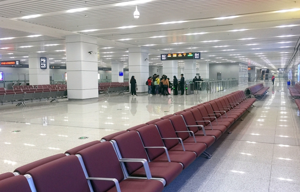 鄭機(jī)城鐵機(jī)場(chǎng)站候車(chē)大廳,空蕩的大廳內(nèi)只有少數(shù)乘客