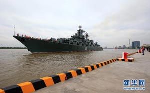 當(dāng)日,參加中俄“海上聯(lián)合—2014”軍事演習(xí)的俄方艦艇陸續(xù)駛抵上海某軍港。中俄兩國海軍互鳴禮炮,中方為來訪的俄艦舉行隆重歡迎儀式。俄羅斯太平洋艦隊旗艦“瓦良格”號導(dǎo)彈巡洋艦駛?cè)胲姼蹠r,參加歡迎儀式的軍樂隊奏響歡迎曲。隨后,“快速”號驅(qū)逐艦、“潘捷列耶夫海軍上將”號大型反潛艦、“伊利姆”號中型海洋油船、“涅維爾斯科伊海軍上將”號大型登陸艦,“卡拉爾”號海洋拖船陸續(xù)駛?cè)敫劭凇_@次聯(lián)合軍事演習(xí),中俄海軍都派出了主戰(zhàn)艦艇參加。中方參演兵力包括導(dǎo)彈驅(qū)逐艦、導(dǎo)彈護衛(wèi)艦、綜合補給艦以及導(dǎo)彈艇等水面艦艇8艘、潛艇2艘、固定翼飛機9架。俄方參演兵力包括巡洋艦、反潛艦、驅(qū)逐艦、登陸艦、油船和海洋拖船等水面艦艇6艘。此外,為執(zhí)行海上聯(lián)合解救被劫持船只、護航等特殊任務(wù),雙方還派出艦載直升機、特戰(zhàn)分隊等兵力參加此次演習(xí)。新華社記者 查春明攝