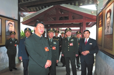 10月31日上午,習(xí)近平帶領(lǐng)全體中央軍委委員一起參觀會(huì)址。習(xí)近平來(lái)到當(dāng)年毛澤東作政治報(bào)告的廳堂,凝望著廊柱上富有鮮明戰(zhàn)斗性的標(biāo)語(yǔ),注視著當(dāng)年會(huì)議代表取暖留下的斑斑炭火印跡,同大家一起回憶先輩們探尋革命道路時(shí)篳路藍(lán)縷、艱辛奮斗的情景,并向大家介紹他每次來(lái)古田參觀的情形和感受。