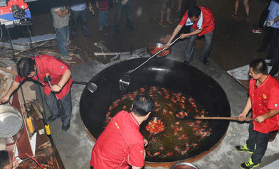 19日,在長沙后湖啤酒音樂節(jié)上,4位廚師用一口直徑達(dá)3.2米的大鐵鍋,用木柴作燃料,歷時3小時,成功烹飪出味道香辣鮮美的1000斤口味蝦,并免費贈送市民品嘗。