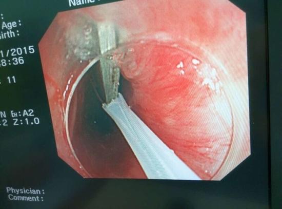 隨后,范醫(yī)生先用圈套器套取出了長10厘米的鑷子,再一個一個地取出了打火機(jī)。整個取出過程小心謹(jǐn)慎而又一氣呵成,只用了不到10分鐘。