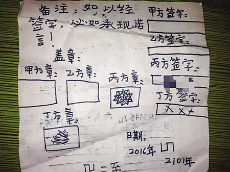 記者看到,這份合同規(guī)定由甲乙丙丁四方簽署,分別代表父、母、小雪和未來的弟弟或妹妹。條款規(guī)定大致如下:1。生了二胎以后(無論男女、龍鳳、雙胞胎),甲方乙方不可偏心丁方,要以從前那種態(tài)度對待丙方。2。不可以丁方太小或經(jīng)濟(jì)不寬裕為由,克扣丙丁雙方的吃穿用度。該條款下具體擬定了衣服、喝奶和飲食要求,如丁方每月3件衣服,每天必須喝奶,哭了爸媽必須安撫;自己作為丙方,每月2件裙子,飯食飲水不可少一件,自己可以照顧弟妹,不可偏心。以上條款經(jīng)過簽字,必須兌現(xiàn)承諾。合同期限為2016年~2101年。甲乙丙丁四方分別留有簽字、蓋章的空格,其中丙方的簽字和蓋章(圖畫)已簽署完畢。