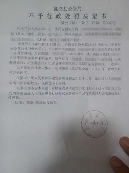 被害人家屬翻拍的一份由隆堯縣公安局對(duì)其中一名肇事學(xué)生開(kāi)具的不予行政處罰決定書。7月24日下午,河北省邢臺(tái)市隆堯縣堯山中學(xué)一名初一學(xué)生,因?yàn)椴辉敢饨桢X而在補(bǔ)習(xí)班遭受了兩名女生長(zhǎng)達(dá)4分鐘的辱罵、毆打,另一名學(xué)生還把整個(gè)過(guò)程用手機(jī)拍攝下來(lái)并上傳網(wǎng)絡(luò),視頻在當(dāng)?shù)乇化偪駛鞑ァ?/p>