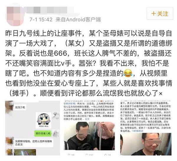 1. 我當(dāng)時(shí)就在這節(jié)車廂里,大媽自始至終都是在好好跟他商量,讓座給另一個(gè)抱娃的,這小伙子根本沒有讓出來的意思。這也罷了,畢竟正如他后來自己所說,沒有法律規(guī)定必須讓座。但后來他反而拿手機(jī)拍大媽,周圍好幾個(gè)乘客看不下去也拿手機(jī)反拍他。一開始他還很得瑟對(duì)鏡頭做勝利的手勢(shì),后來突然搶了對(duì)面妹子的手機(jī),還抓傷了對(duì)方。被幾個(gè)男士按倒之后說了一串外語,其中聽到了罵人的話。