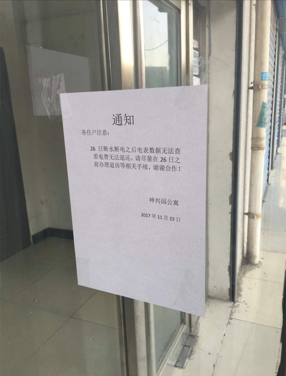 記者此前實(shí)地調(diào)查了解到,根據(jù)通州臺(tái)湖鎮(zhèn)政府下發(fā)的通知,亦園青年創(chuàng)業(yè)園周邊包括武夷公寓在內(nèi)的5家公寓應(yīng)于11月26日全面停水停電。