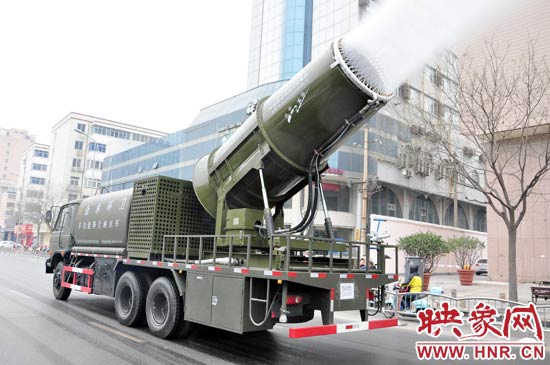 映象網(wǎng)訊(記者 王濤 通訊員 司佳 文/圖)“向著霧霾開(kāi)炮……向著揚(yáng)塵開(kāi)炮……”12月26日上午,鄭州市經(jīng)三路街頭出現(xiàn)了一輛形似炮筒的“大家伙”,吸引了來(lái)往車輛及行人的目光。