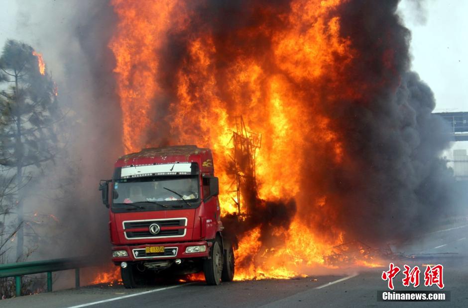 1月23日下午4時(shí)許,滬昆高速公路江西弋陽往貴溪方向593公樁(貴溪收費(fèi)站附近)一輛載有133部電動(dòng)車的半掛車起火,導(dǎo)致電動(dòng)車被大火“吞噬”。江西貴溪消防官兵接警后迅速到場撲救,半小時(shí)后將大火撲滅。據(jù)司機(jī)稱,火災(zāi)疑因高速護(hù)坡雜草叢起火產(chǎn)生的火芯飄至半掛車,引燃包裝電動(dòng)車的紙殼箱所致。中新社發(fā) 龔武 攝