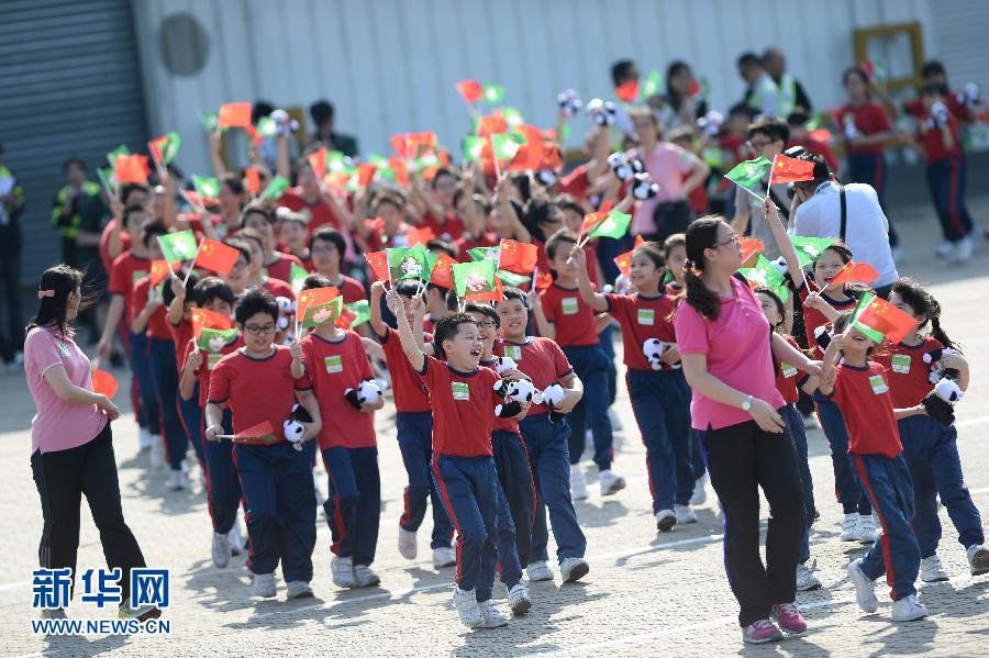 4月30日,孩子們?cè)诎拈T機(jī)場迎接大熊貓。當(dāng)日16時(shí)許,中央政府贈(zèng)送澳門的新一對(duì)大熊貓運(yùn)抵澳門,澳門特區(qū)政府行政法務(wù)司司長陳海帆等官員及部分少年兒童在機(jī)場迎接。大熊貓經(jīng)檢疫人員檢查后在運(yùn)輸籠中向前來接機(jī)的人們短暫亮相。目前它們身體狀況良好,隨后將前往金像農(nóng)場進(jìn)行30天隔離檢疫。新華社記者張金加攝