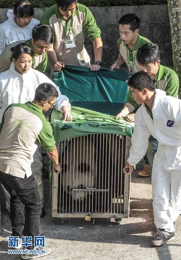 4月30日,工作人員將大熊貓運(yùn)送到澳門路環(huán)金像農(nóng)場的隔離設(shè)施地點(diǎn)。當(dāng)日16時(shí)許,中央政府贈(zèng)送澳門的新一對(duì)大熊貓運(yùn)抵澳門,澳門特區(qū)政府行政法務(wù)司司長陳海帆等官員及部分少年兒童在機(jī)場迎接。大熊貓經(jīng)檢疫人員檢查后在運(yùn)輸籠中向前來接機(jī)的人們短暫亮相。目前它們身體狀況良好,隨后將前往金像農(nóng)場進(jìn)行30天隔離檢疫。新華社記者張金加攝