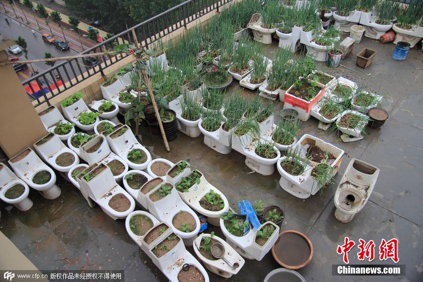 2015年07月16日,山東省菏澤市,在中央公館小區(qū)21號樓樓頂?shù)南榔脚_上,有業(yè)主擺放了數(shù)十個(gè)廢棄馬桶,種上了各種蔬菜。還用廢舊沙發(fā)搭起了鴨棚,養(yǎng)起了鴨子。在樓頂?shù)慕锹淅?,記者還發(fā)現(xiàn)了一個(gè)簡易廁所。該樓居民表示,“菜園”的主人平時(shí)就直接使用廁所糞便作為蔬菜的肥料。天氣炎熱時(shí),氣味很大,附近居民苦不堪言。