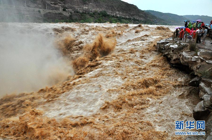 8月2日,游客在山西吉縣黃河壺口瀑布景區(qū)游覽觀瀑。受上游強(qiáng)降雨天氣影響,黃河干流晉陜峽谷水位暴漲,濁流滾滾奔騰而下,使得位于山西吉縣和陜西宜川交界的壺口瀑布瀑面驟然變大,形成400多米寬的特大瀑布群,氣勢磅礴,蔚為壯觀。新華社發(fā) 呂桂明 攝 圖片來源:新華網(wǎng)