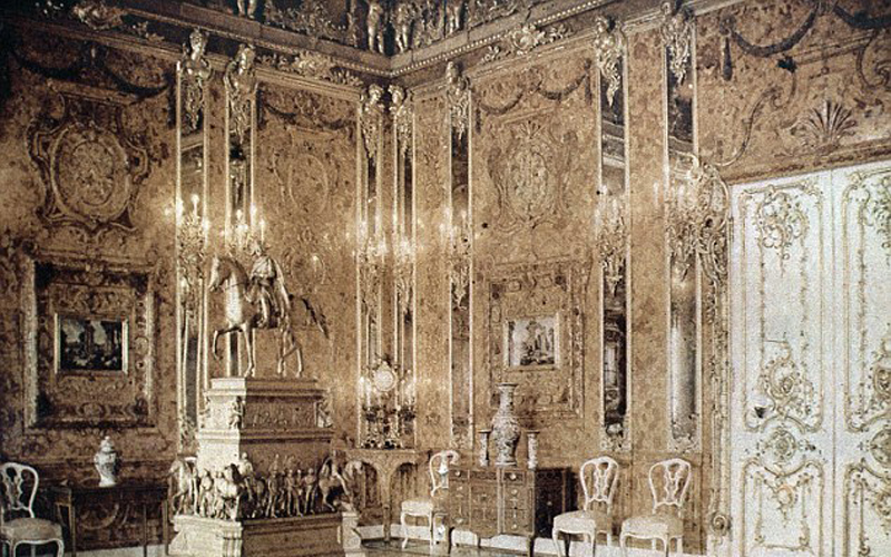 據(jù)悉,所謂的琥珀屋最初據(jù)說只是一個琥珀櫥柜,但最終被擴大為琥珀屋,共用掉450公斤琥珀,直到1770年才完工。納粹于1941年10月份攻陷位于圣彼得堡附近的凱瑟琳宮,并將琥珀屋拆除帶走,最終通過鐵路將琥珀屋運回當(dāng)時東普魯士的科尼斯堡城堡(Koenigsberg Castle)安放??墒窃?945年1月份,這里遭到空襲和激烈的地面攻擊,琥珀屋從此下落不明。