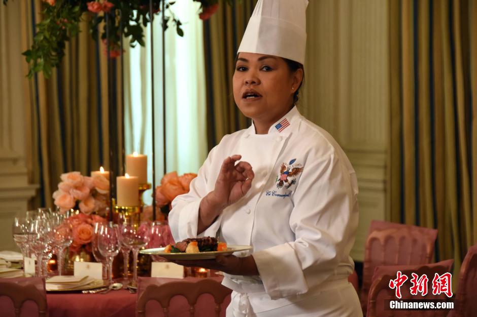 當(dāng)?shù)貢r(shí)間9月24日,美國(guó)白宮第一夫人辦公室發(fā)布了白宮為中國(guó)國(guó)家主席習(xí)近平和夫人彭麗媛舉行的國(guó)宴的菜單,并介紹了餐桌布置等情況。據(jù)這份菜單,紹興黃酒和南瓜月餅將亮相國(guó)宴。此外,白宮還邀請(qǐng)了華裔名廚參與此次國(guó)宴的準(zhǔn)備。 中新社記者 刁海洋攝
