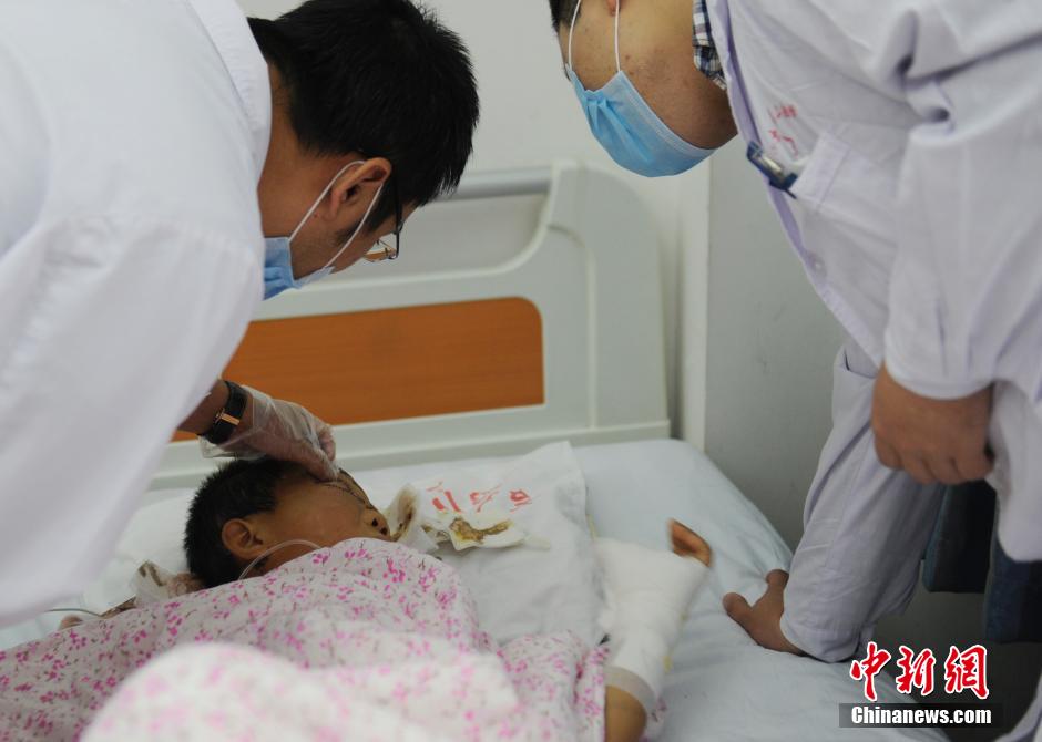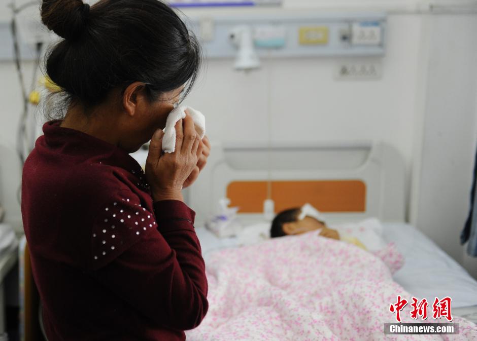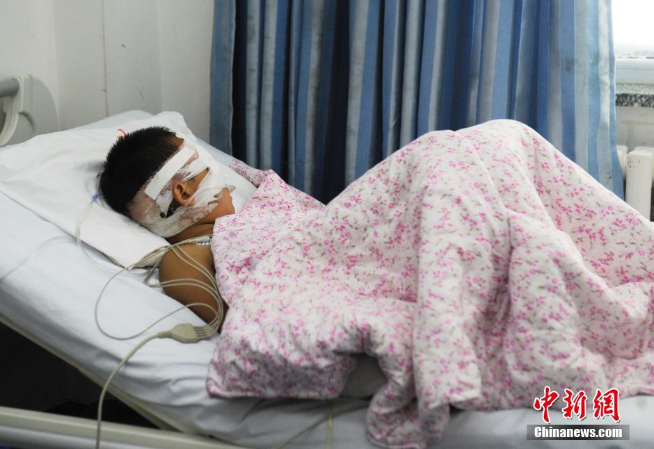 10月13日,12歲的朱某正在吉林大學(xué)第二醫(yī)院接受治療。據(jù)其家人介紹,10月11日,朱某獨(dú)自在家,遭同村村民王某挖出雙眼,行兇者還點(diǎn)燃了他家的房子,朱某靠裝死逃過一劫。王某事后自殺。目前雖經(jīng)手術(shù)治療,但朱某右眼視力已無恢復(fù)的可能,左眼亦不樂觀。警方正對(duì)此案進(jìn)行調(diào)查。中新社記者 張瑤 攝
