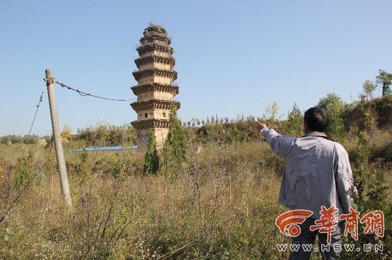 12日,住在離塔不遠(yuǎn)處的村民趙先生告訴華商報(bào)記者,在他的印象中,這座塔發(fā)生傾斜已經(jīng)有20多年了,大約在2005年前后。銅川新區(qū)管委會的工作人員在塔身上系上了一根鋼索,目的是為防止塔身繼續(xù)傾斜?!摆s緊把這塔保護(hù)一下,再不保護(hù)這塔可能就沒有了?!壁w先生說,除了傾斜、風(fēng)蝕,導(dǎo)致塔體破壞外,偶爾還有盜墓賊光顧,他們在他周圍打了好幾個(gè)盜洞,這也加速了塔的破壞。