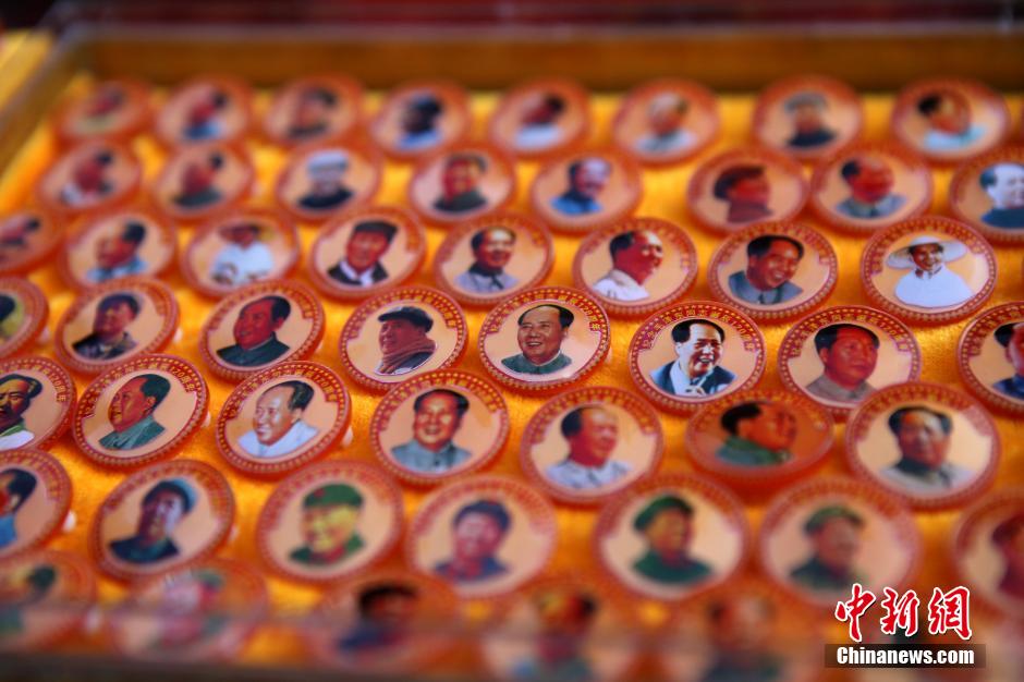 12月26日,是毛澤東誕辰122周年紀念日,河南鄭州紫荊山紫荊山廣場,鄭州退休老軍人李廷林依照毛澤東的照片或畫像制成的120枚毛澤東紀念章亮相。中新社記者 王中舉 攝