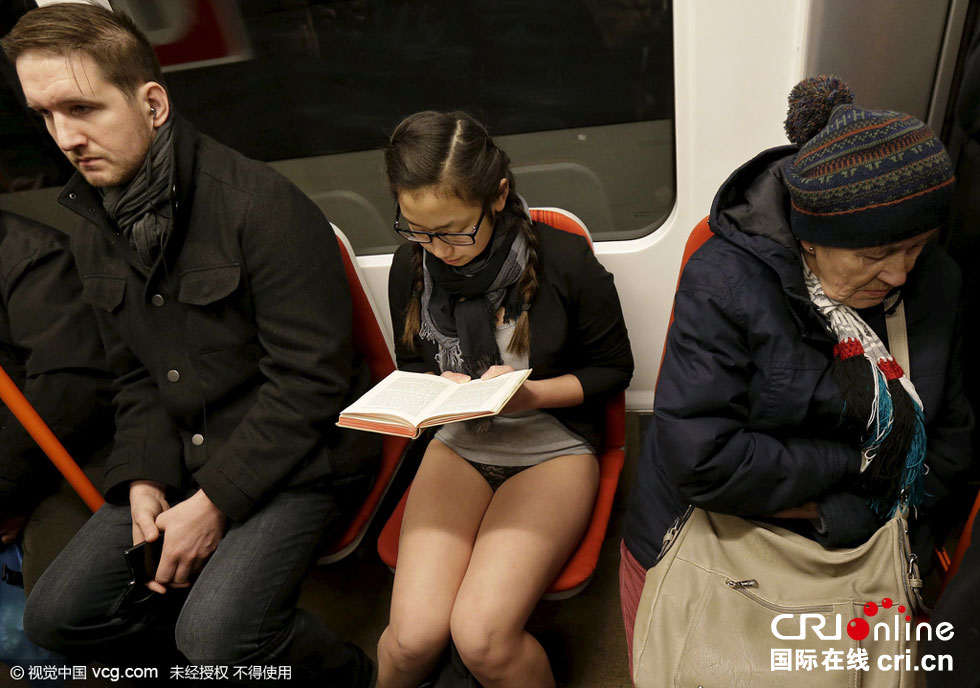 當(dāng)?shù)貢r(shí)間2016年1月10日,奧地利維也納,“地鐵無(wú)褲日”當(dāng)天,乘客穿短褲乘車。圖片來(lái)源:視覺中國(guó)