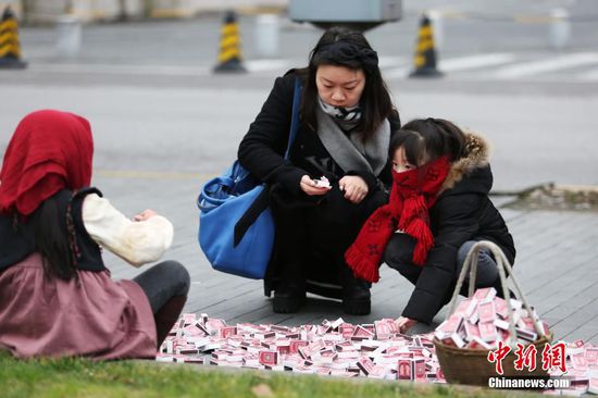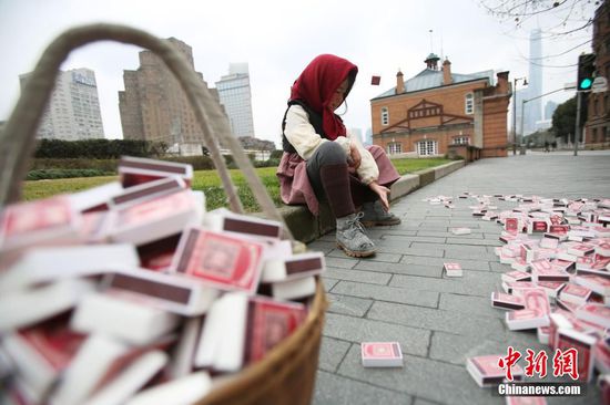 1月12日,上海外灘街頭出現(xiàn)一位小女孩,她身穿古典長(zhǎng)裙,頭裹赭紅色圍巾,挎著裝滿火柴的小竹籃,在寒風(fēng)中向過往的路人送小火柴。據(jù)了解,這是一次“愛心衣櫥”幫助中國(guó)山區(qū)孩子擺脫寒冷的愛心募捐活動(dòng)。在寒冷的冬天,他們嘗試以“賣火柴的小女孩”活動(dòng),喚起社會(huì)的關(guān)注,把更多的溫暖傳遞到中國(guó)山區(qū)寒冷孩子的手上。只要掃一掃火柴盒上的二維碼,就可以立刻向山區(qū)孩子送上一套溫暖新衣。張亨偉 攝