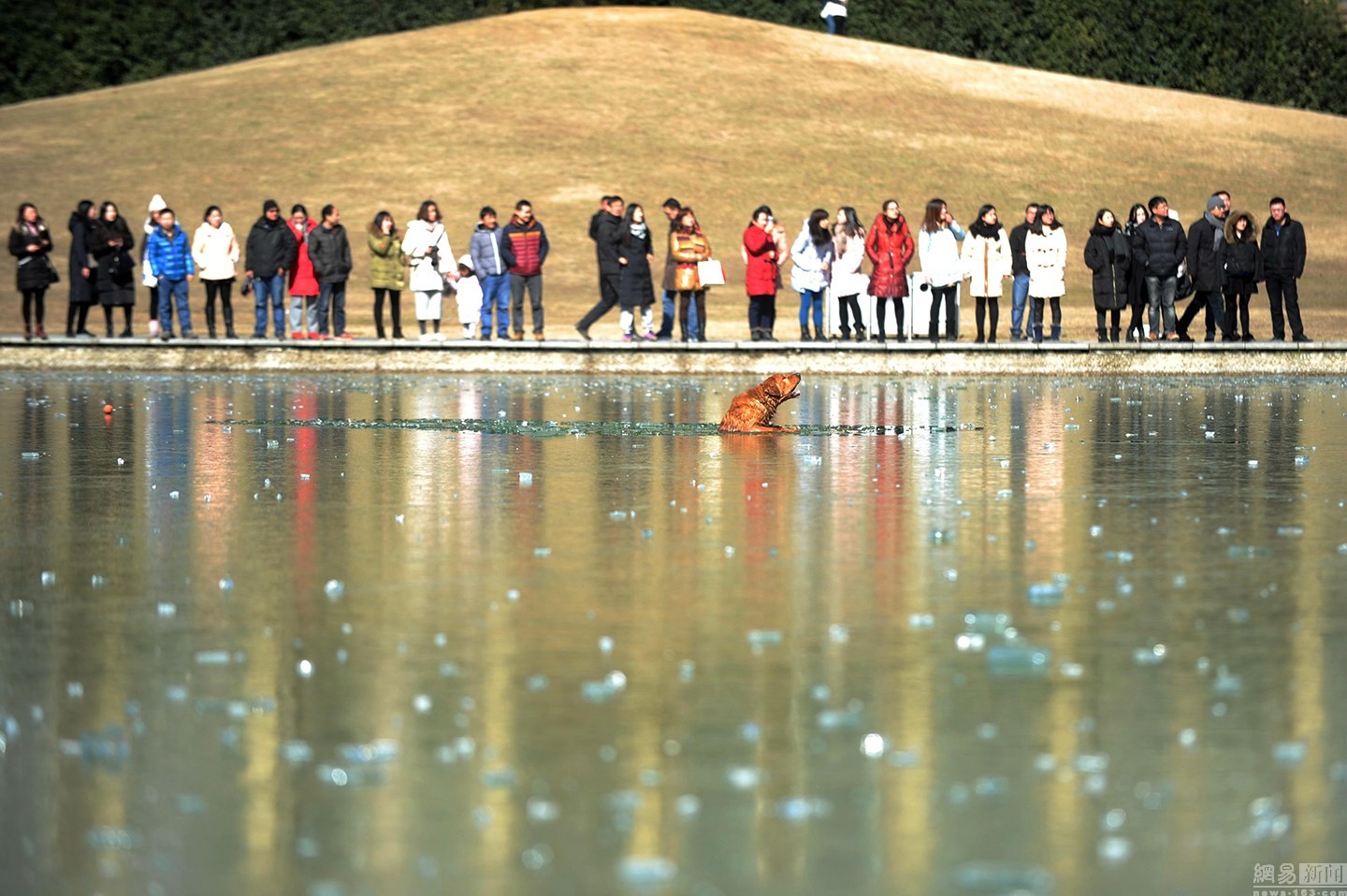 2016年1月25日中午12時(shí)30分許,安徽合肥市民項(xiàng)先生正好在賴少其藝術(shù)館附近辦事,突然他發(fā)現(xiàn)一只大金毛被卡在藝術(shù)館門口的冰面中,一直在掙扎。