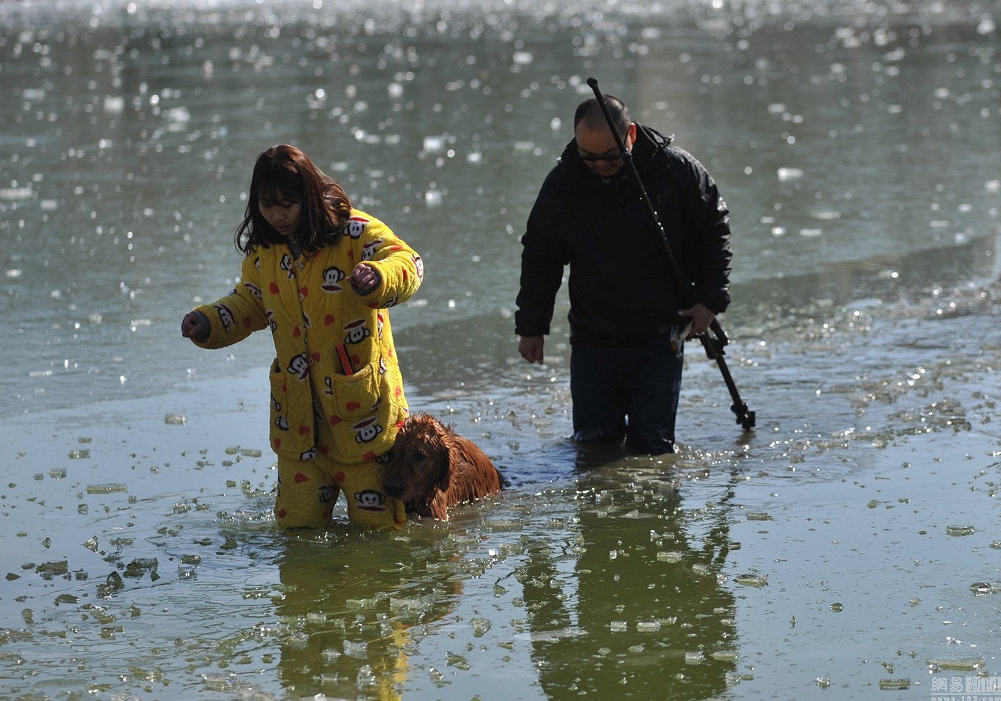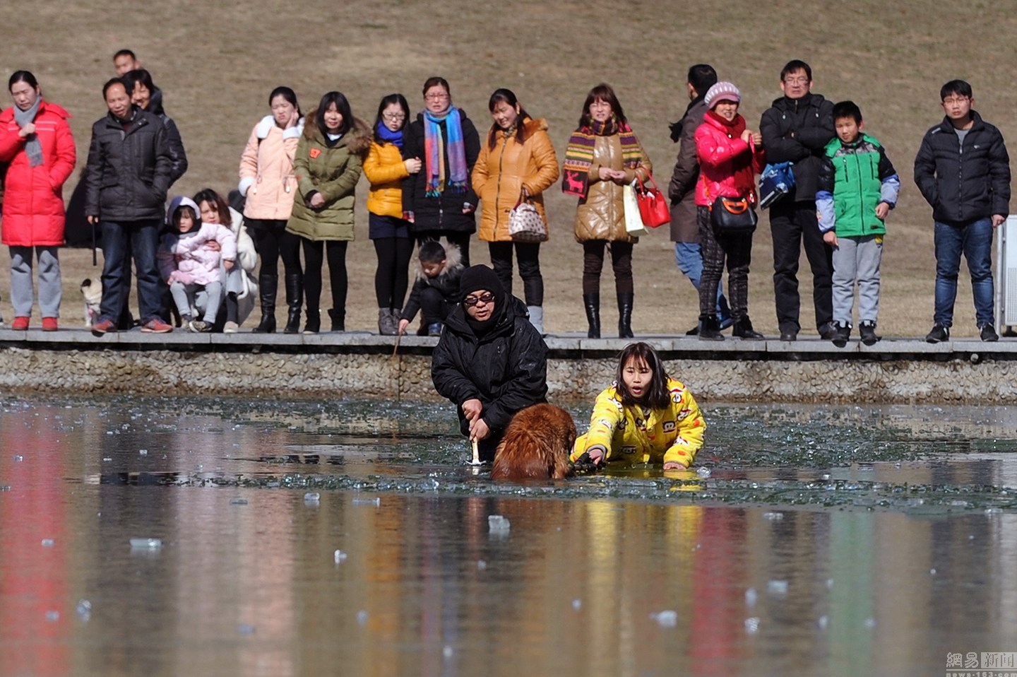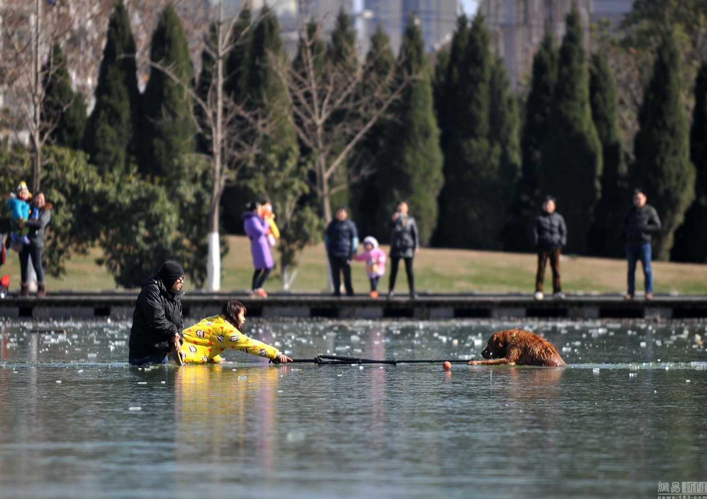 “我知道這水不深,自己又會(huì)游泳。”面對冰冷的水面,項(xiàng)先生并沒有多想,只想趕緊救出狗狗。圖為兩人合力救金毛現(xiàn)場。