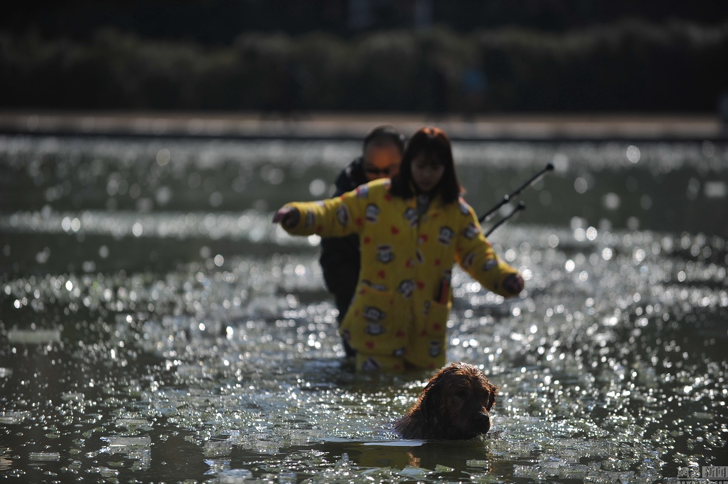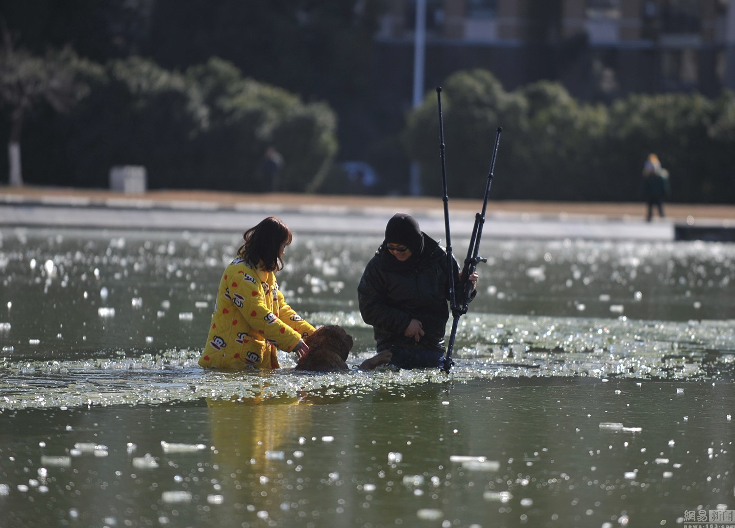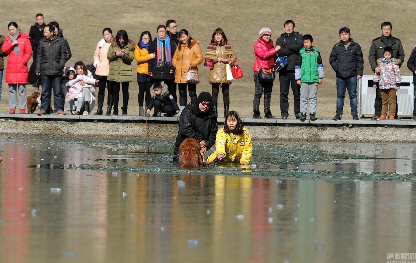 “我知道這水不深,自己又會(huì)游泳。”面對冰冷的水面,項(xiàng)先生并沒有多想,只想趕緊救出狗狗。圖為兩人合力救金毛現(xiàn)場。