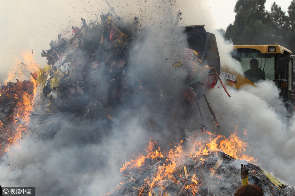 祈?,F(xiàn)場,濃濃的煙霧讓人睜不開眼,兩輛大型鏟車不停地處理燃燒物,幾十個(gè)工作人員甚至用上了滅火器來處理殘留物。供圖:視覺中國