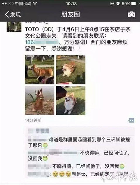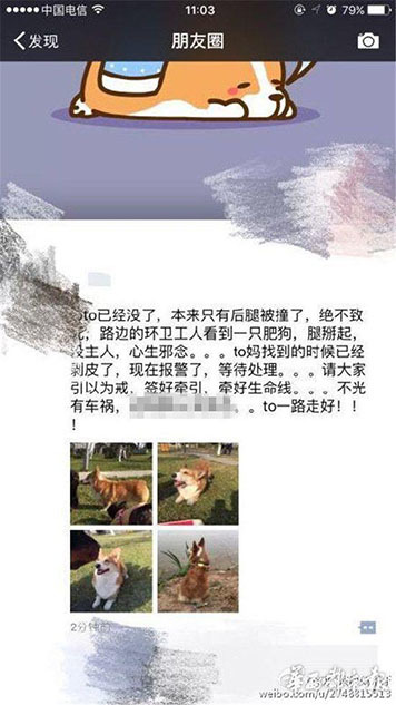 據(jù)主人李女士講述,“早上8點(diǎn)20分左右,我媽媽帶狗出去散步,它跟著別的狗跑丟了。我們找了很久?!崩钆空f,小狗跑丟后,在成都一愛寵微信群里,有群友稱在三環(huán)路上看到過它,“說是它橫穿三環(huán)路,把后腿撞到了,它就沿著三環(huán)路跑了?!眻D為李女士在朋友圈發(fā)布的尋狗信息。