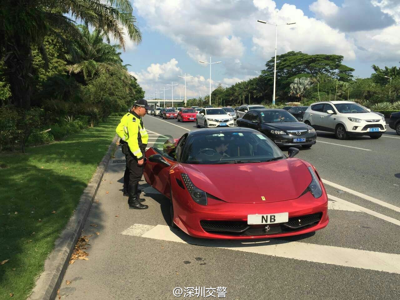深圳交警5月7日17:16發(fā)布了一條微博:“當鐵騎遇到他……”,同時配上四張圖片:只見一輛掛著“NB”車牌的紅色跑車被交警鐵騎攔下,最后被帶走。