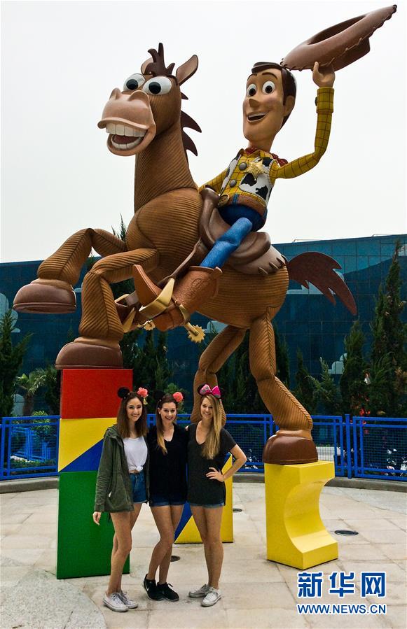 5月15日,參與內(nèi)部測試的游客在上海迪士尼玩具總動員酒店的廣場前留影。當日,上海迪士尼主題酒店之——玩具總動員酒店大堂、廣場、餐廳、度假區(qū)短駁車等區(qū)域及設施開始內(nèi)部測試。這家共有800個房間的主題酒店將于6月中旬正式迎客。新華社發(fā)(鈕一新 攝)