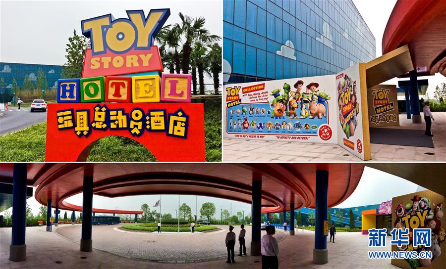 5月15日拍攝的上海迪士尼玩具總動員酒店入口標志(左上)、酒店大門(右上)和酒店大堂(下)(拼版圖片)。當日,上海迪士尼主題酒店之——玩具總動員酒店大堂、廣場、餐廳、度假區(qū)短駁車等區(qū)域及設施開始內(nèi)部測試。這家共有800個房間的主題酒店將于6月中旬正式迎客。新華社發(fā)(鈕一新 攝)