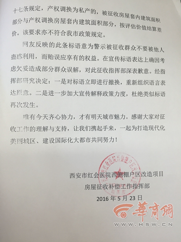 對于標語上的用詞是否恰當?劉組長表示,確實考慮欠妥造成部分群眾誤解,征收指揮部深表歉意。5月23日下午,已將標語進行撤換,并重新制作新的標語懸掛。