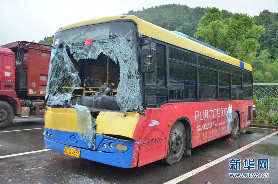 浙江舟山被車輪擊中的公交車(6月3日攝)。