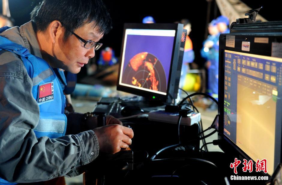 6月7日凌晨,專家正在操作水下機(jī)器人對(duì)沉船內(nèi)部進(jìn)行查勘。當(dāng)日,四川廣元沉船事故救援現(xiàn)場(chǎng),參與救援的水下機(jī)器人先后兩次下水,并通過攝像頭在翻沉的“雙龍”號(hào)船內(nèi)發(fā)現(xiàn)有遇難者以及一些漂浮物品。中新社記者 劉忠俊 攝