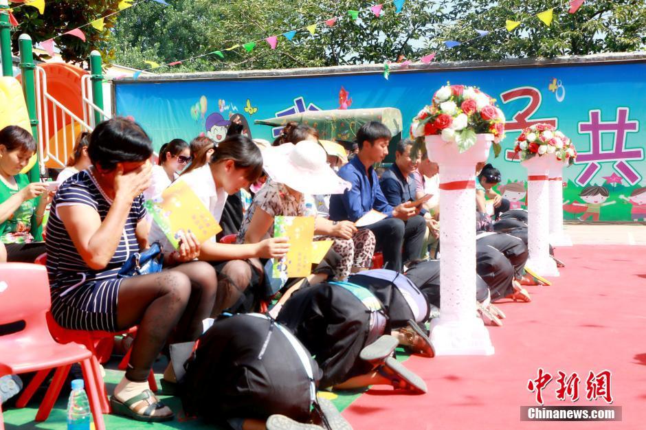 又到一年畢業(yè)季,6月20日,河南商水縣鄧城鎮(zhèn)留守兒童幼兒園60名孩子迎來了一場特殊的畢業(yè)典禮。孩子們身穿迷你學士服,自信地走紅毯、拋學士帽。在跪謝父母養(yǎng)育之恩的環(huán)節(jié),因為大部分孩子是留守兒童,孩子們只能跪謝爺爺奶奶的照顧,許多家長在現(xiàn)場感動落淚。葉青 攝