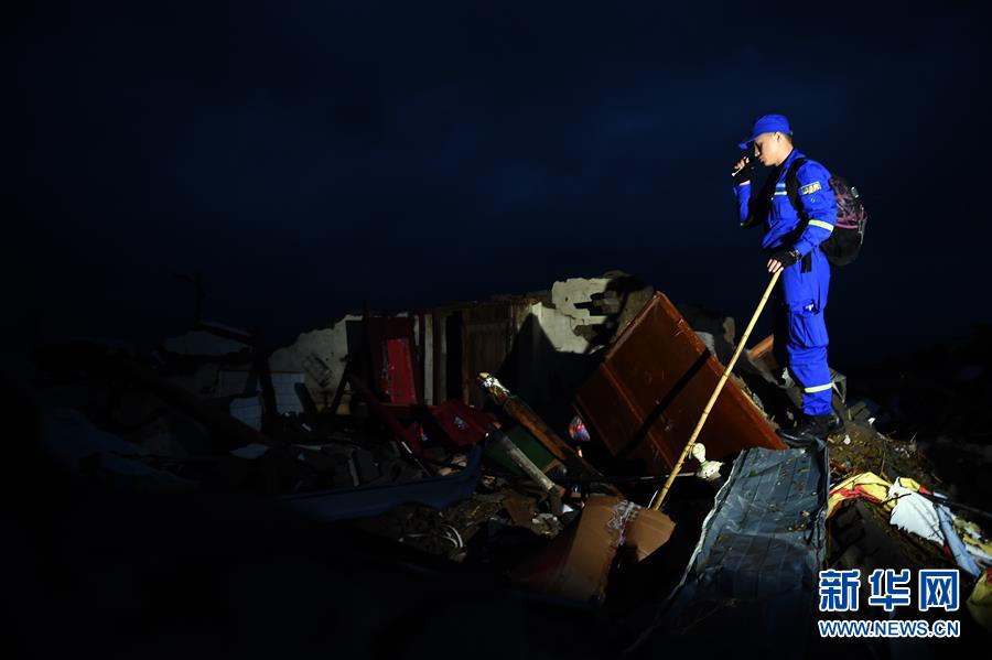 6月24日黎明,搜救人員在鹽城市阜寧經(jīng)濟開發(fā)區(qū)北陳村進行排查搜救。新華社記者李響攝