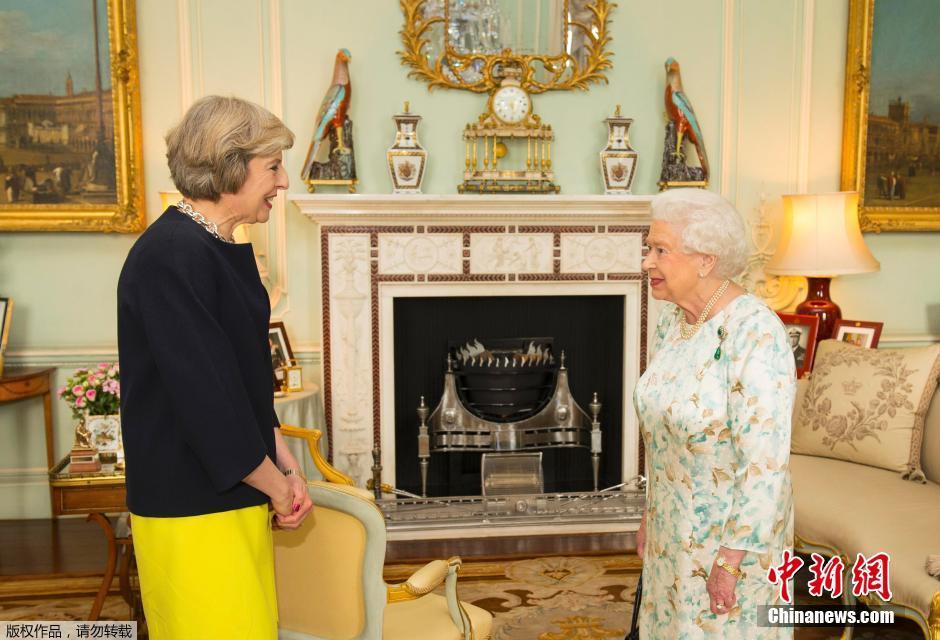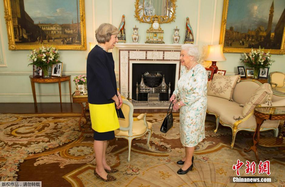 當(dāng)?shù)貢r(shí)間2016年7月13日,英國倫敦,英國女王伊麗莎白二世在白金漢宮接見特蕾莎·梅,并任命其為新首相。特蕾莎是英國女王伊麗莎白二世在位期間的第13任首相,同時(shí)也是繼撒切爾夫人后的第二位女首相。