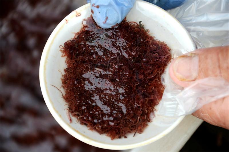 仔細觀察才發(fā)現(xiàn)男子們都身穿連體防水衣,在蹲在發(fā)臭的河水中,將網(wǎng)撒到河底后左右攪拌,河底的淤泥被攪了上來,河水立刻變得非常渾濁,搖晃漁網(wǎng)篩去淤泥后,把剩下的紅線蟲倒入塑料袋中。