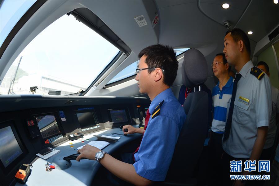 技術(shù)人員在寶蘭高鐵高速綜合檢測列車司機(jī)室作業(yè)(5月16日攝)。
