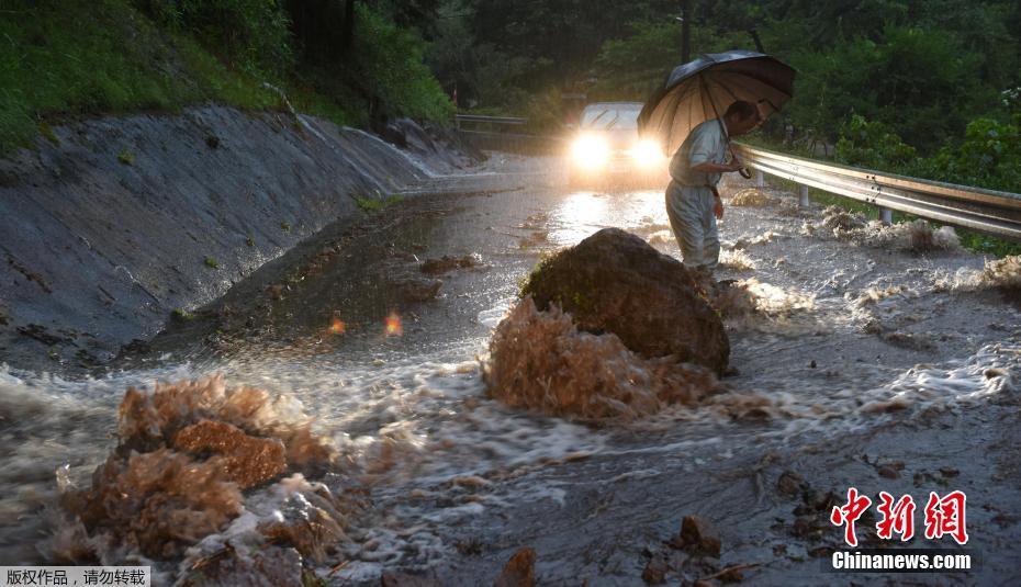 當?shù)貢r間2017年7月5日,臺風“南瑪都”為日本九州地區(qū)帶來強降雨。圖為九州島大分縣,大雨導(dǎo)致巨石滾落,交通癱瘓。