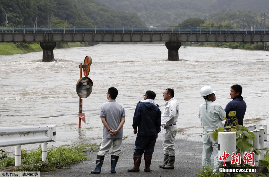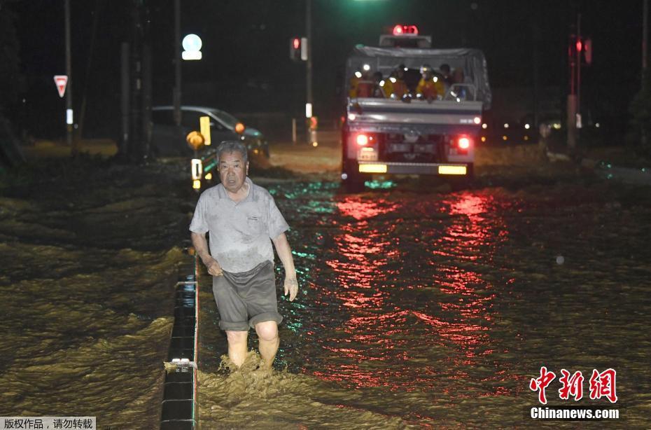 臺風導(dǎo)致日本最少47班國內(nèi)線航班取消,3000名旅客受影響,3人因風暴引起的事故受傷。圖為福岡縣朝倉地區(qū)的居民在洪水中跋涉。