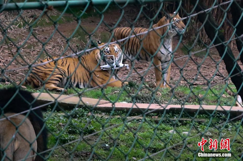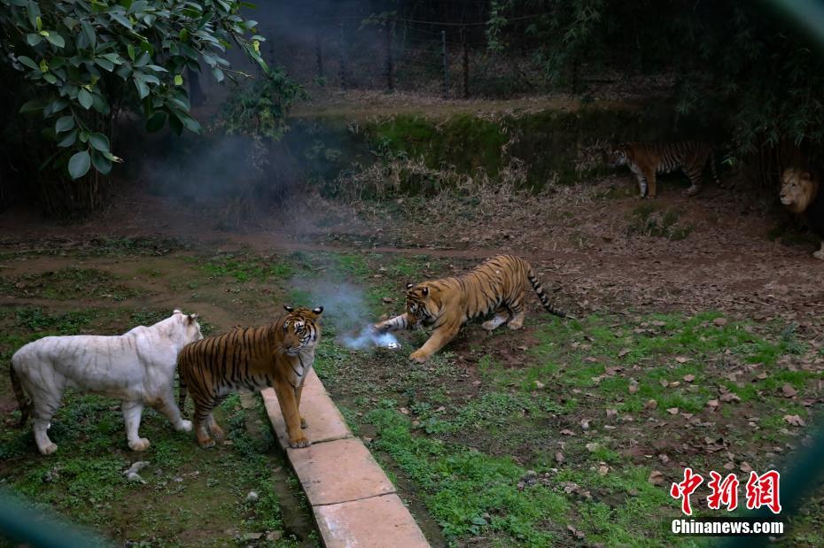 另一群老虎圍著電池打量,其中一只突然上前咬上一口,電池瞬間爆燃冒煙。王成杰 攝
